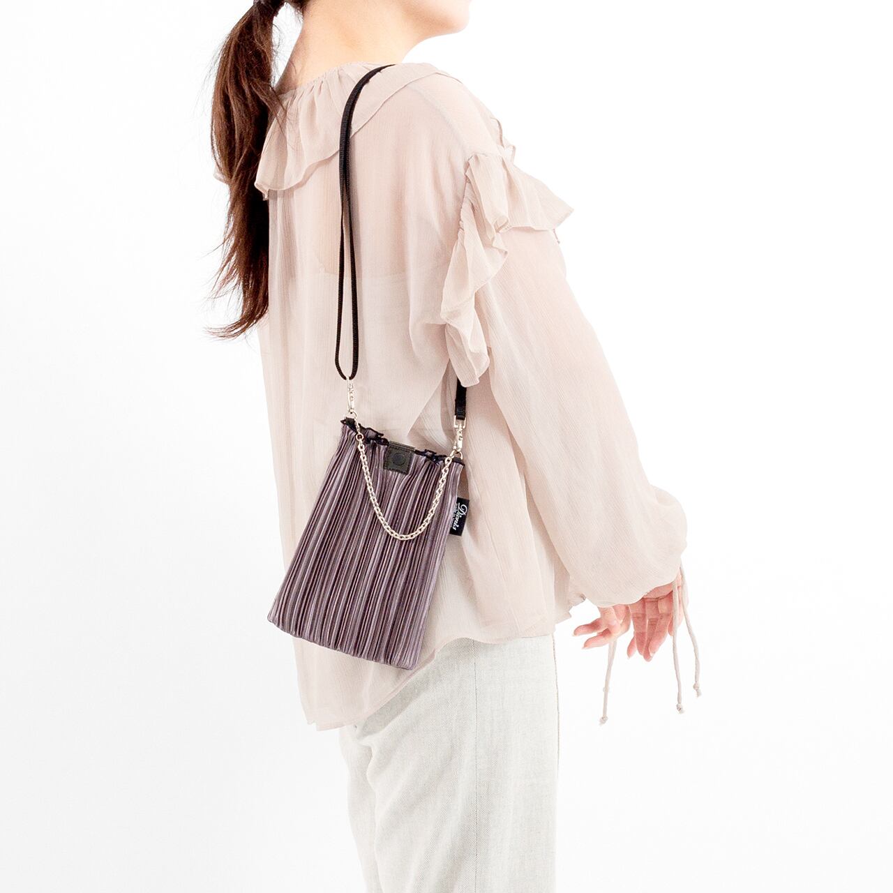 細かなプリーツのフリフリ感を活かした可愛らしいデザインでミニバッグとしてコーディネートのポイントになります。
