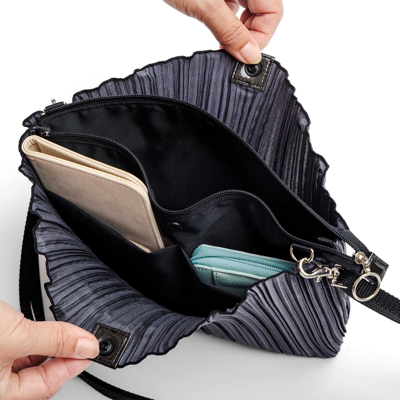 プリーツのポケットがついた、長財布も入るショルダーバッグです。