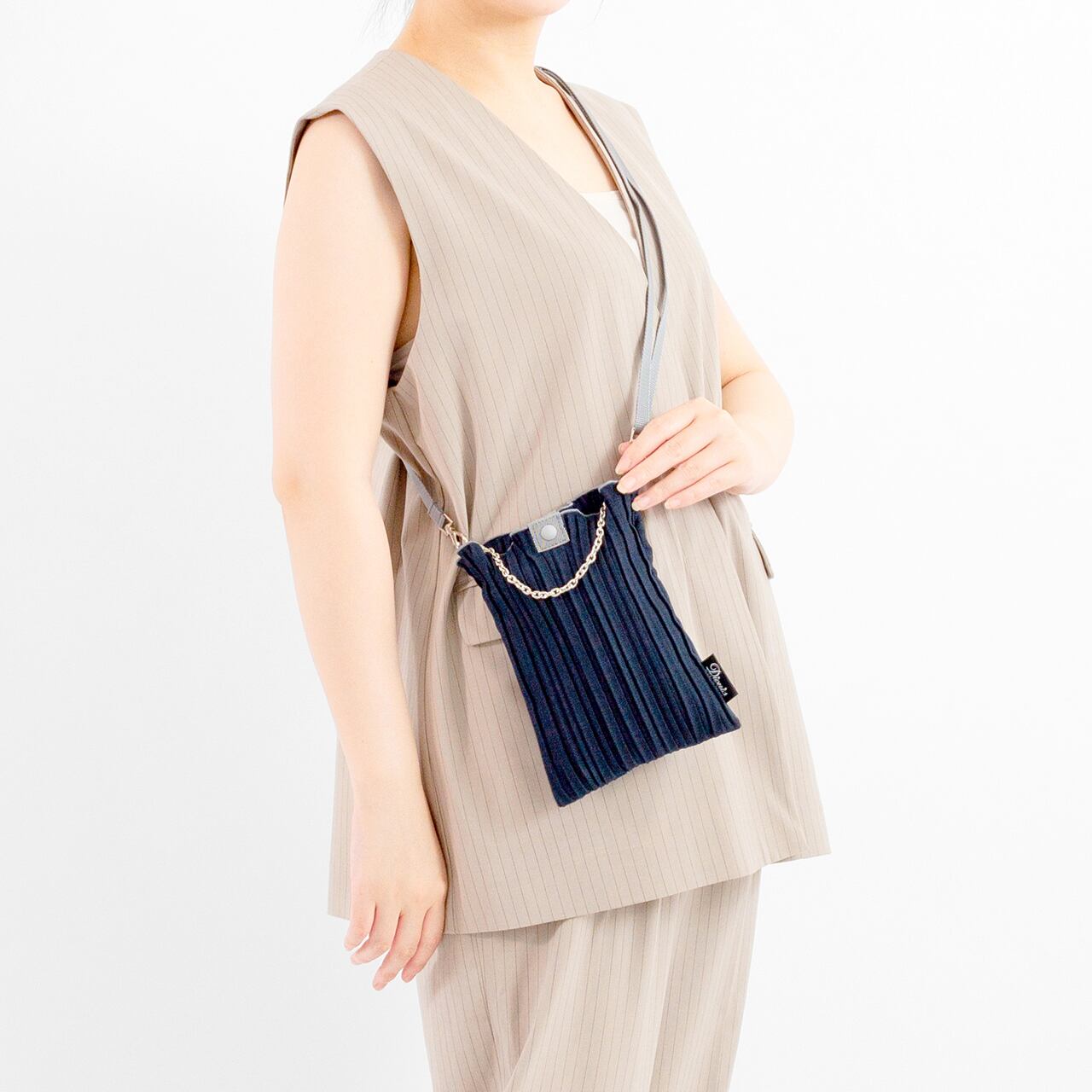 スマホを持ち運ぶのにちょうど良いサイズ感のメイン室に、外側はプリーツのポケットになっていて、やわらかな肌触りです。