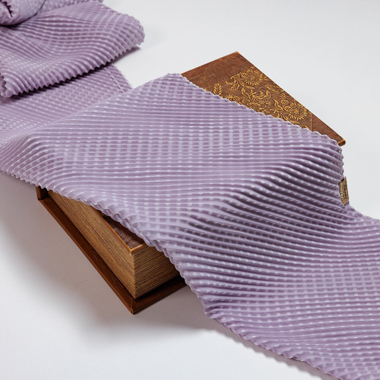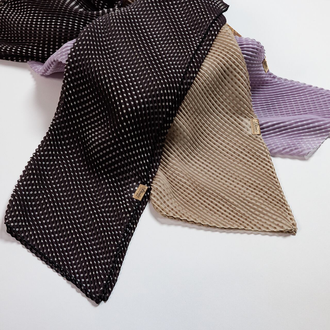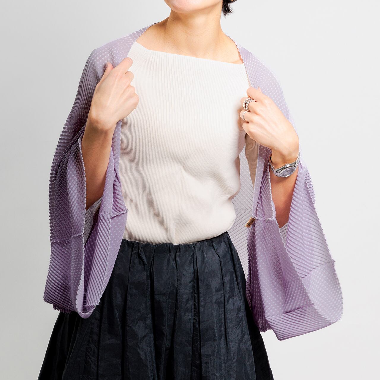 プリーツデザインは均一に施され、ドット柄が見え隠れし、着るたびに個性的な印象を与えます。