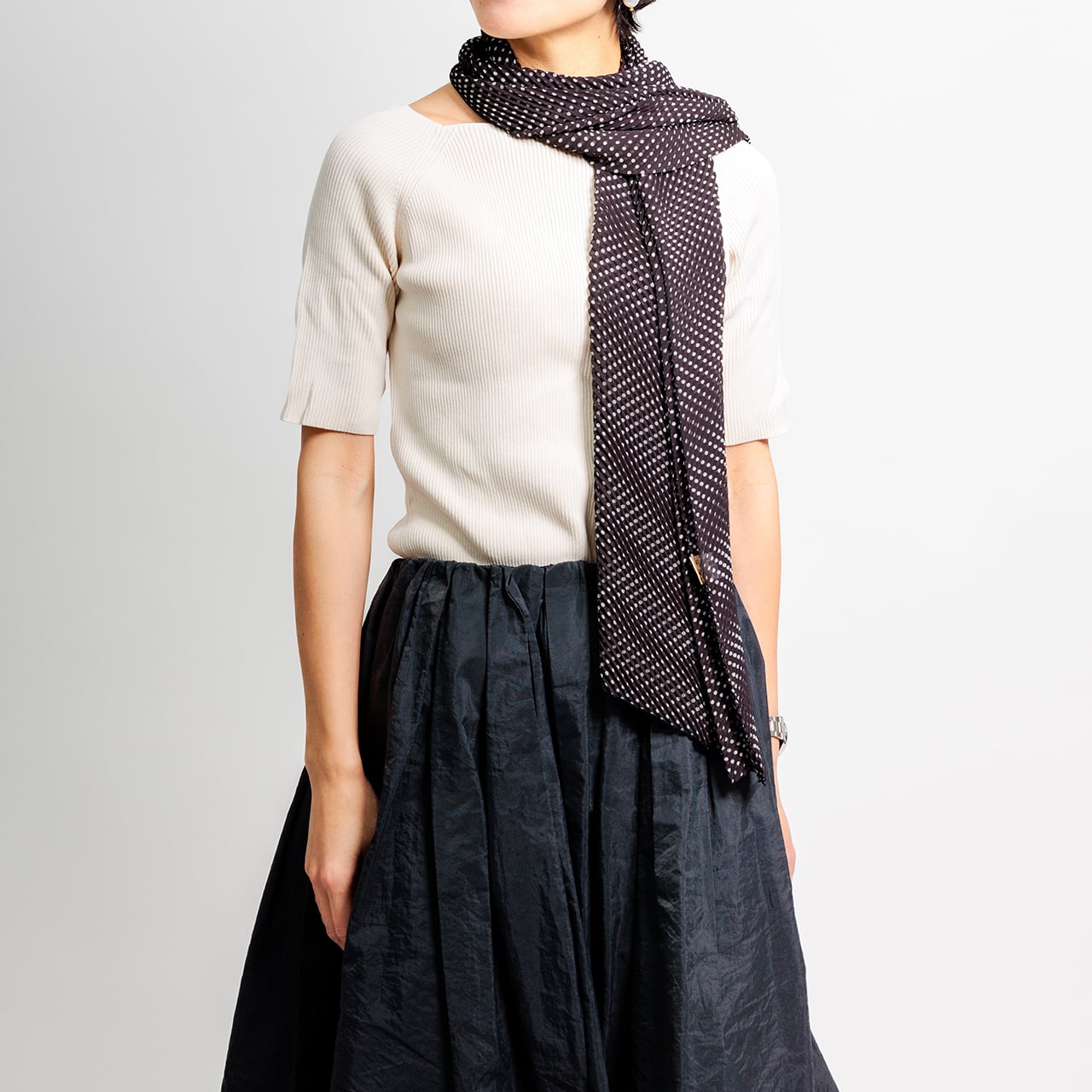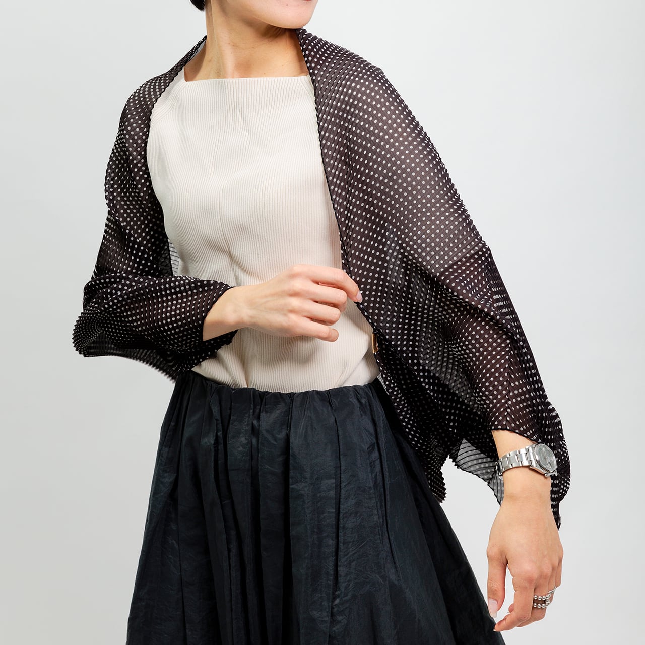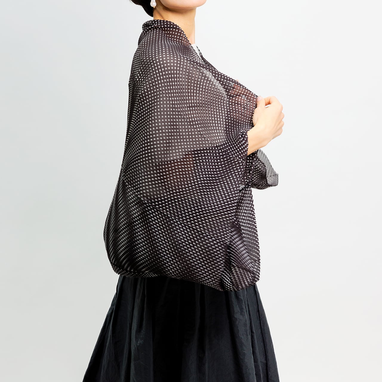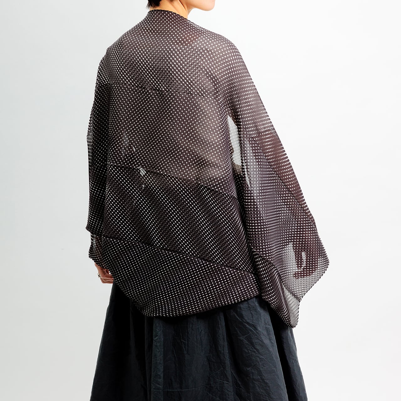 プリーツデザインは均一に施され、ドット柄が見え隠れし、着るたびに個性的な印象を与えます。