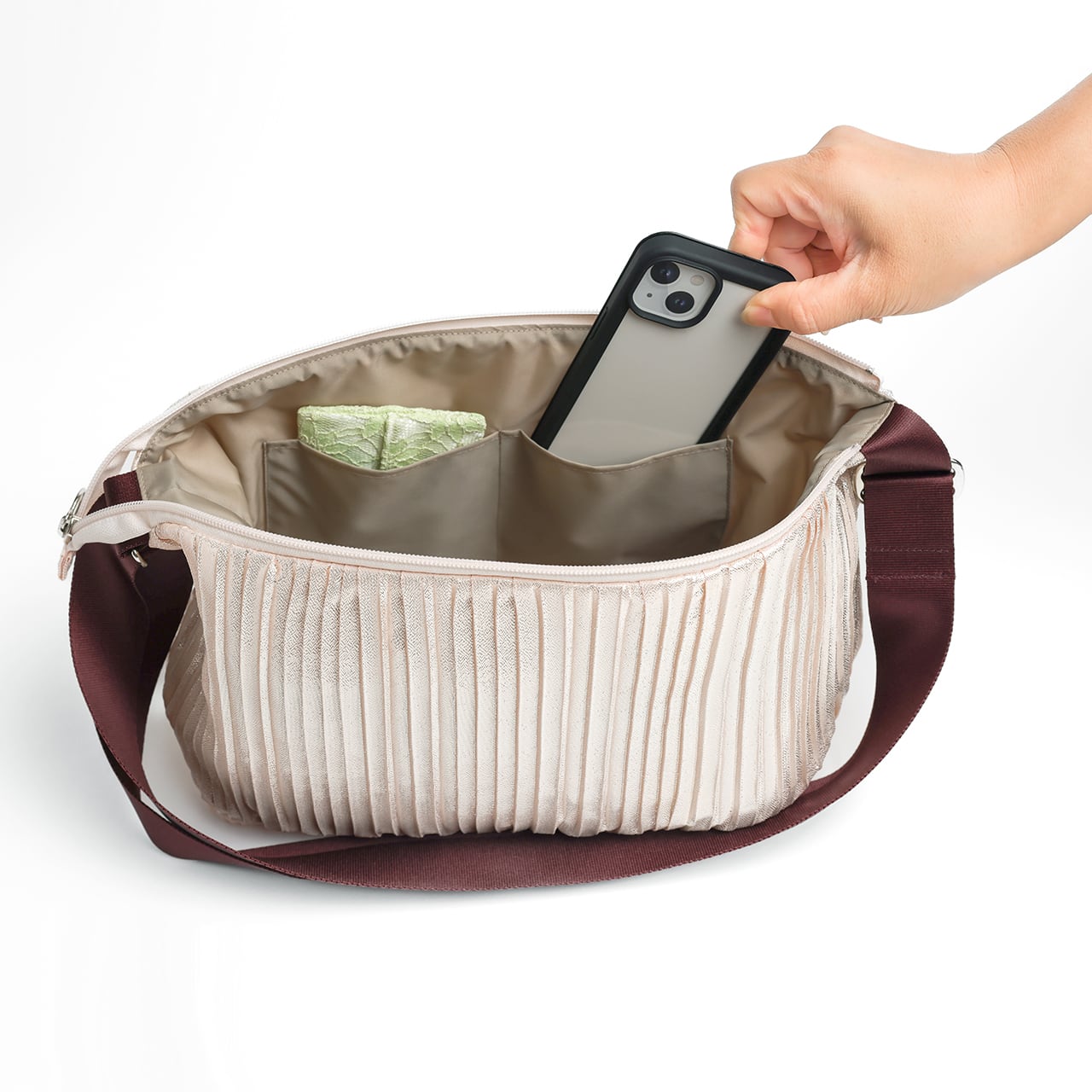 このプリーツショルダーバッグは、メタリックな光沢と華やかなラメが魅力のアイテムです。撥水加工が施されているため、突然の雨でも安心してお使いいただけます。ファスナー仕様で安心感も抜群で、日常使いやお出かけに最適です!