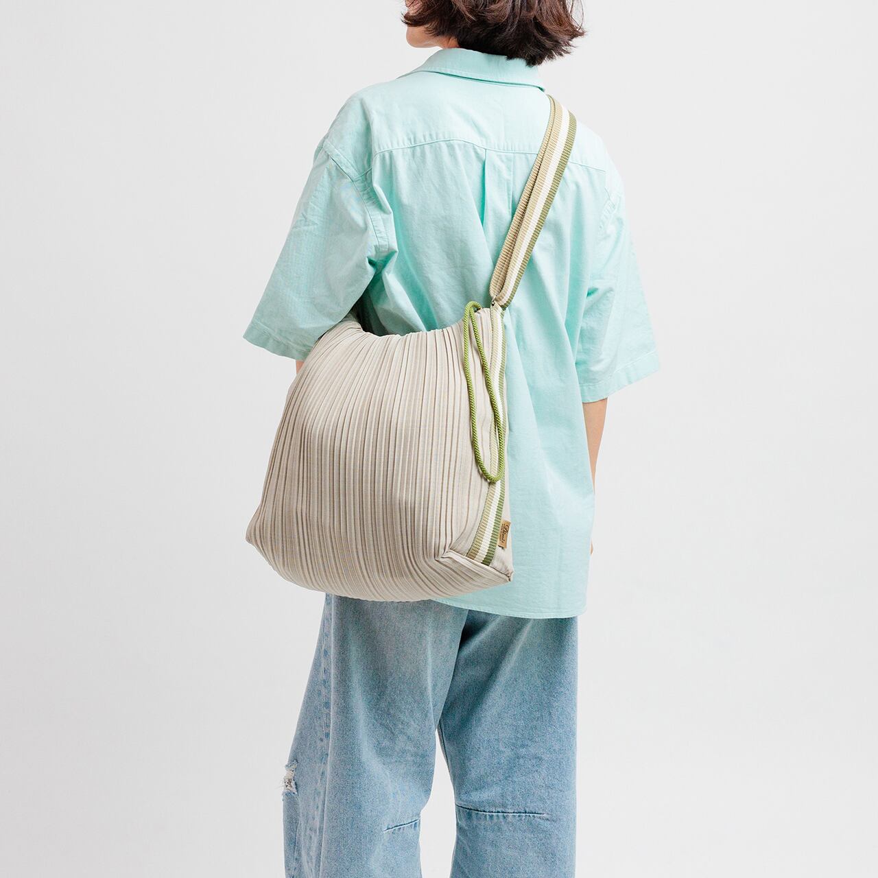 D:ECO ストレートプリーツショルダーバッグは、リサイクルポリエステルを使用し、環境に配慮したドライな風合いが魅力のアイテムです。軽量で中綿入りのため、持ち運びも快適。旅行シーンでも活躍する大容量設計で、普段使いやお仕事のお供としても大活躍します!